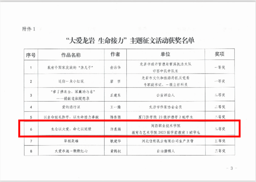 2024年6月3日,教育与艺术学院23级学前教育1班许惠娟同学在“大爱龙岩 生命接力”主题征文活动中荣获二等奖。