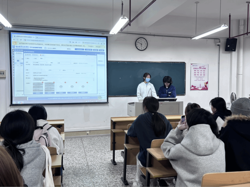会议开始,两位同学向大家说明,素质分不仅是奖学金评定的重要依据之一,也是学生评优评先等方面的重要依据。在讲解环节,孙晓晴同学展示了系统录入与审核的主要流程,对每个容易出错的关键节点都进行重点标注和提醒,着重体现了素质分的重要性。并强调,为确保素质分录入的公平、公正和高效,素质分审核和驳回操作流程极为重要。审核过程中需仔细核对学生提交的活动名称、时间、地点等信息,确认证明材料是否齐全、真实,是否符合学校规定的加分标准。部分班委反映了关于信息不完整、活动不符合加分标准等问题,吴敏同学和孙晓晴同学耐心聆听每一个问题,结合实际情况,耐心细致地为同学们讲解驳回及重新录入流程,加深了大家对素质分评定规则的理解和认识。
