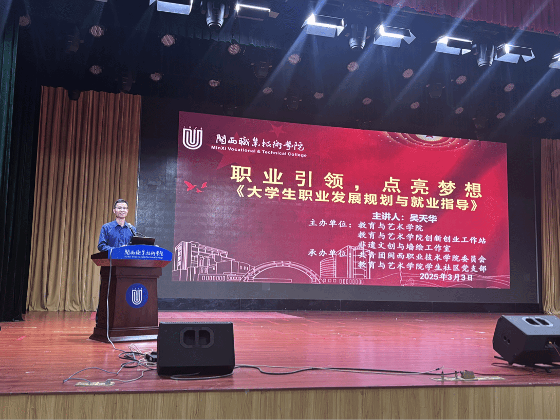 为帮助大学生明确职业方向,做好职业规划,提升就业竞争力,2025年3月3日,教育与艺术学院、教育与艺术创新创业工作站、非遗文创与墙绘工作室联合主办“职业引领,点亮梦想—《大学生职业发展规划与就业指导》”讲座。活动由吴丽婷老师主持,23级全体学生和24级五年专学生积极参与,院党委副书记黄翠宝、黄磊老师、郑灿阳老师、团委书记黄庆春以及企业家魏艳蓉出席本次讲座。