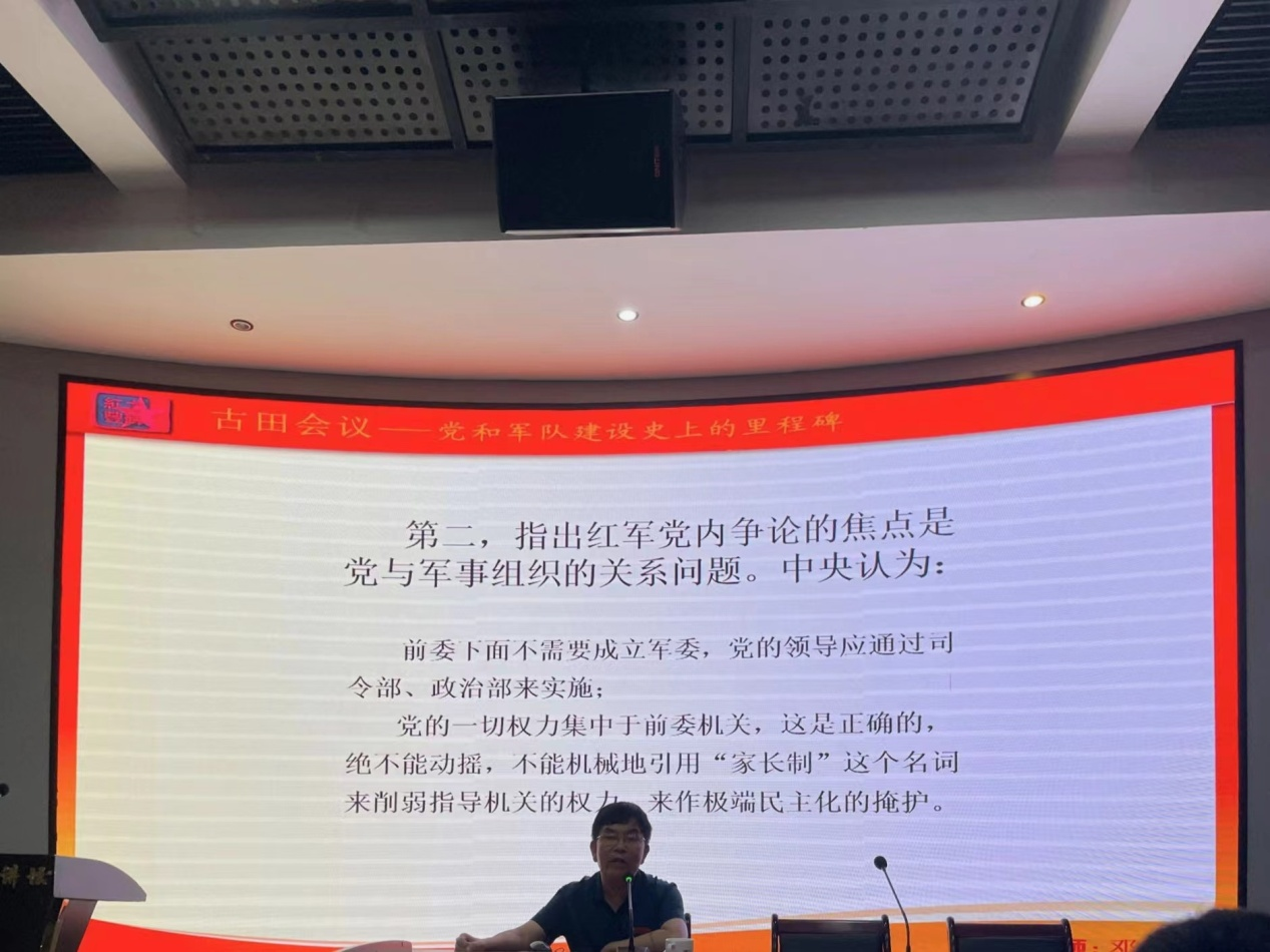 邓泽村教授从“朱毛红军入闽的背景”“红四军党内的分歧与争论”“古田会议的召开、主要精神及历史意义”三个方面,以生动的语言讲述了一个又一个红色经典故事,以理论联系实际的形式,深入浅出地为大家分析古田会议召开的前因后果。他认为,古田会议的精神在于一是政治建军,筑魂固本,确立人民军队建军纲领;二是思想建党,永葆先进,着重从思想上建党;三是求真务实,勇闯新路,实事求是思想路线初步形成。