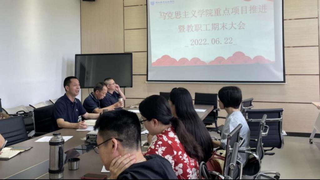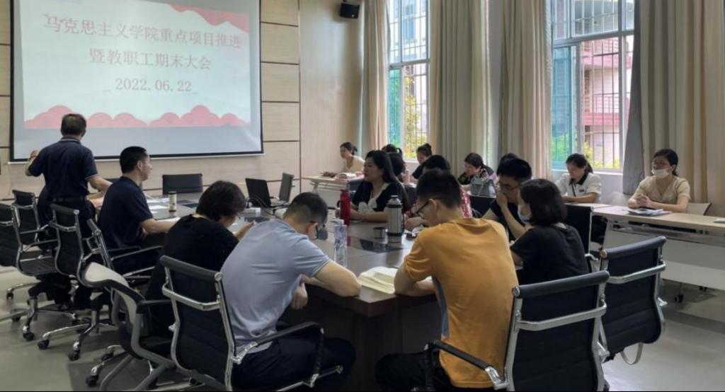 马克思主义学院高度重视学校“文明校园”及“双高校”建设、《红旗不倒》金课项目建设,在平时抓紧抓实日常工作的基础上,于6月22日,召开重点项目推进会暨期末工作总结大会,马院全体老师参加会议。