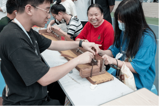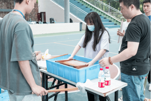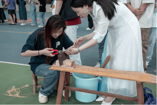 第二环节,非遗沉浸式体验的游园活动。活动项目丰富,有拔篾、编帘、捞纸、书法、猜灯谜等等。活动吸引了广大师生参加,非遗传承人现场展示了浮竹岭纸帘制作技艺流程,指导学生们动手体验。同学们沉浸式体验了非遗项目,感受到非遗文化的魅力。