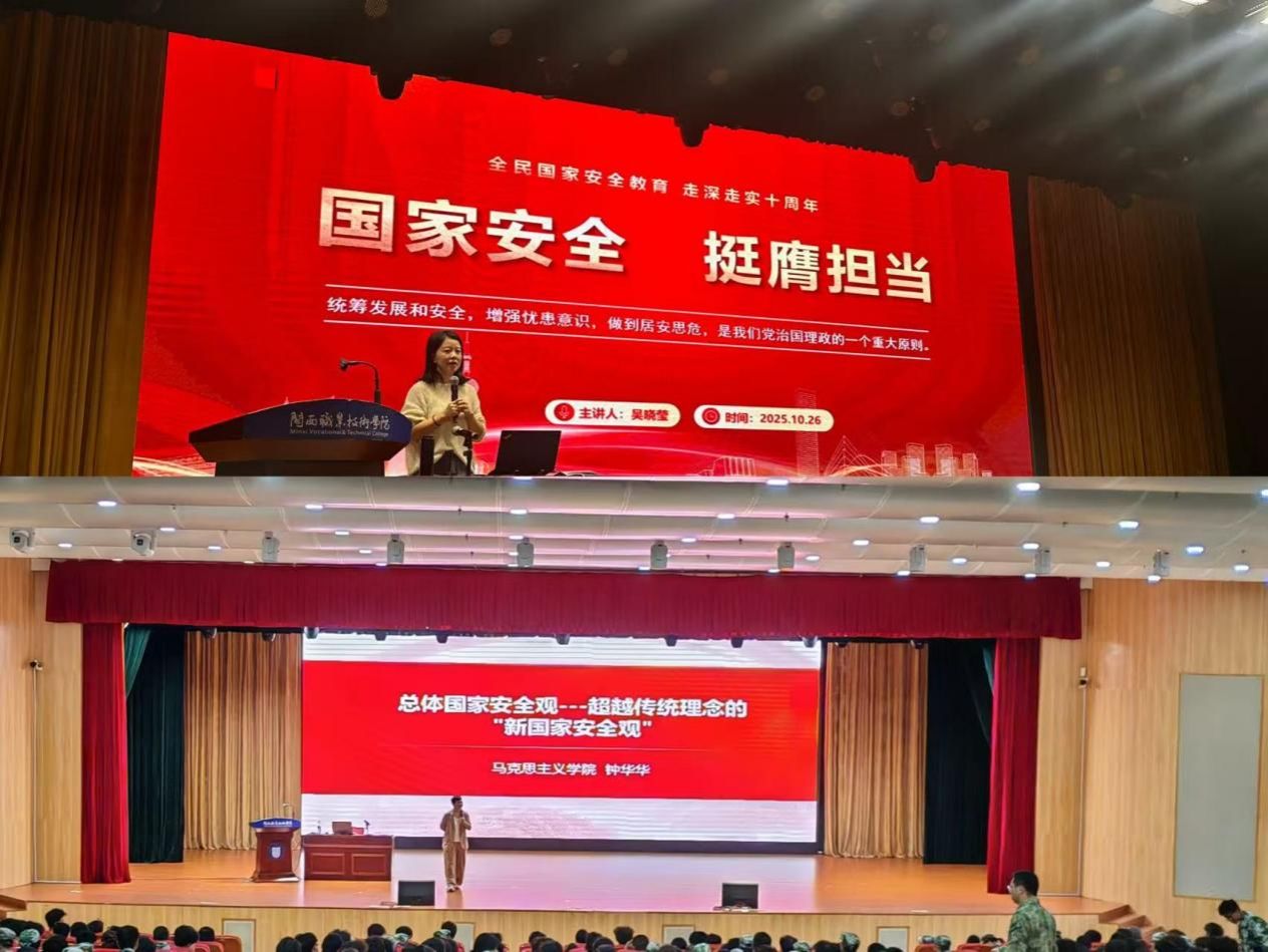 讲座中,主讲教师以总体国家安全观的核心要义为切入点,结合当前国际国内安全形势,从多个维度系统阐释了总体国家安全观的丰富内涵与实践要求。教师通过列举典型案例、解读政策法规,将抽象的安全理论转化为贴近学生生活的生动内容,让新生深刻认识到国家安全并非遥不可及,而是与每个人的学习、生活息息相关。同时鼓励新生传承红色基因,将个人成长与国家发展紧密结合,在学习专业知识、提升综合素养的同时,始终保持对国家安全的高度警惕,主动学习国家安全相关知识,争当国家安全的“守护者”与“宣传员”。