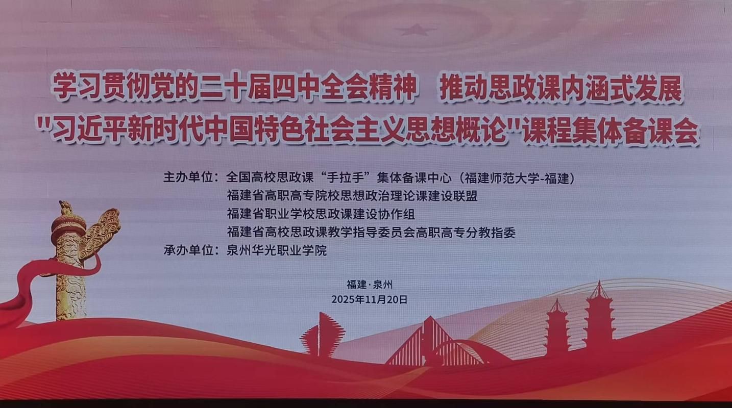 为深入学习贯彻党的二十届四中全会精神,全面落实习近平总书记关于“守正创新推动思政课建设内涵式发展”的重要指示,坚持不懈用习近平新时代中国特色社会主义思想铸魂育人,紧扣职业教育类型定位,推动思政教育与技术培养深度融合,切实筑牢教育强国建设的职教根基,进一步提高思政课的针对性、吸引力与实效性,不断提升思政课教师教学能力与育人水平,福建省高职高专思政课联盟于 2025 年 11 月 19日至 21 日在泉州华光职业学院举办“福建省高职高专院校思政课建设联盟 2025 年会暨福建省职业学校思政课建设协作会议”,MG冰球马克思主义学院负责人参会。