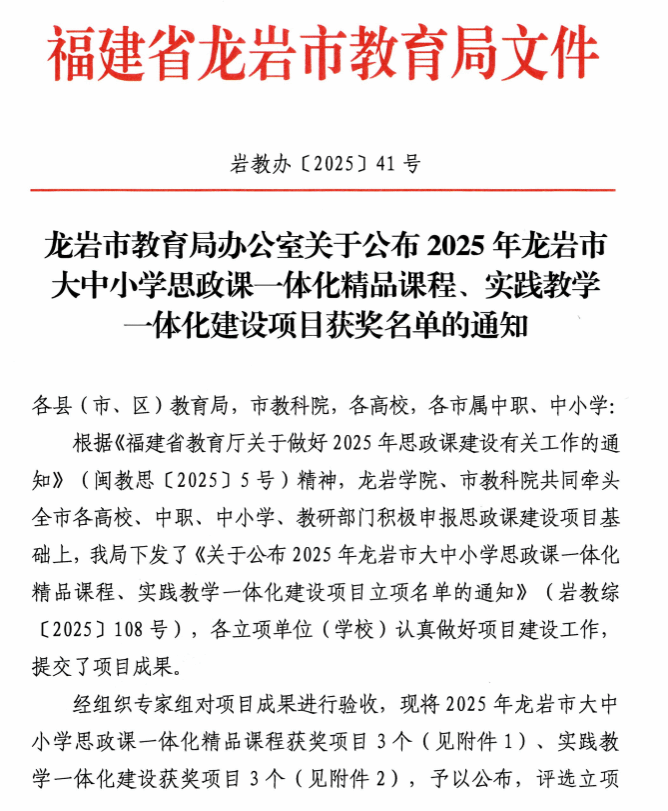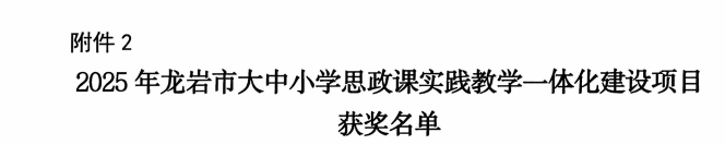 近日,龙岩市教育局公布了2025年龙岩市大中小学思政课一体化精品课程、实践教学一体化建设项目获奖名单,MG冰球马克思主义学院3个项目入选龙岩市大中小学思政课一体化精品课程,3个项目入选实践教学一体化建设项目。