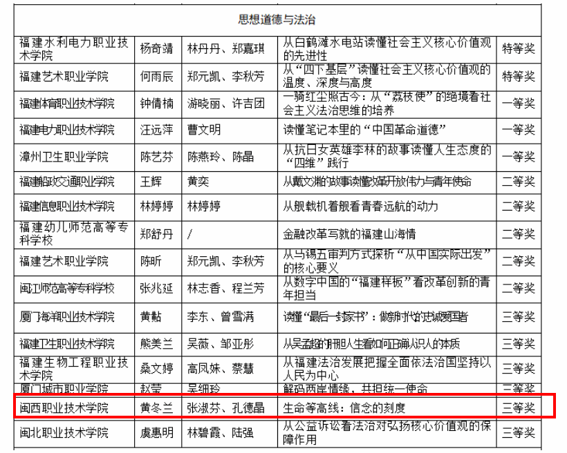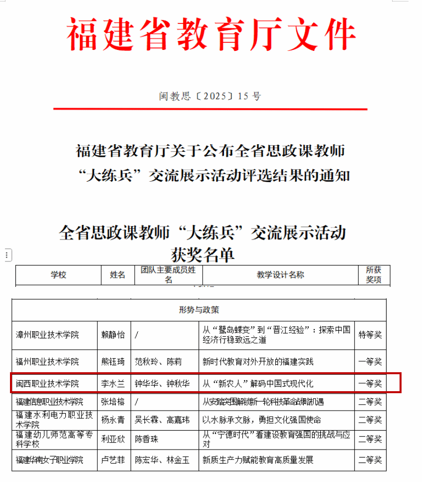 近日,福建省教育厅公布了全省思政课教师 “大练兵”交流展示活动评选结果,MG冰球马克思主义学院两个教师团队斩获佳绩,李水兰团队荣获高职组“形势与政策”课综合展示一等奖,黄冬兰团队荣获高职组“思想道德与法治”课综合展示三等奖。