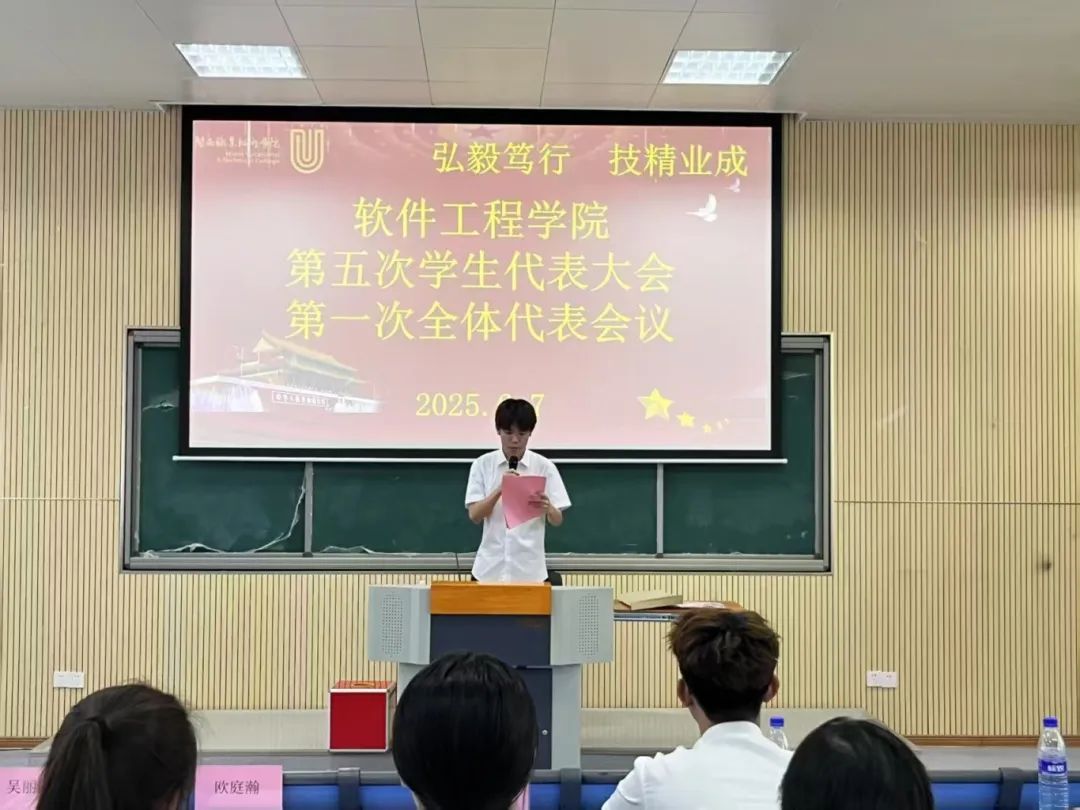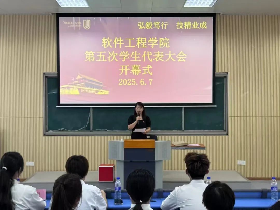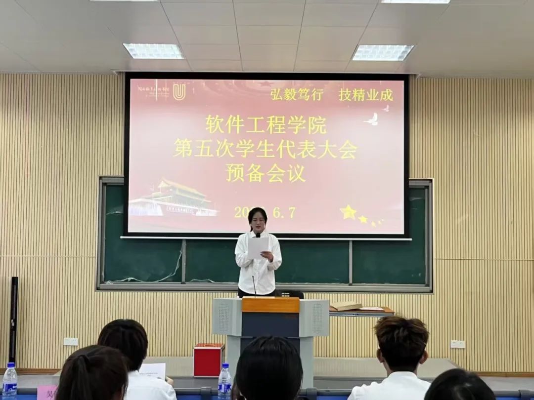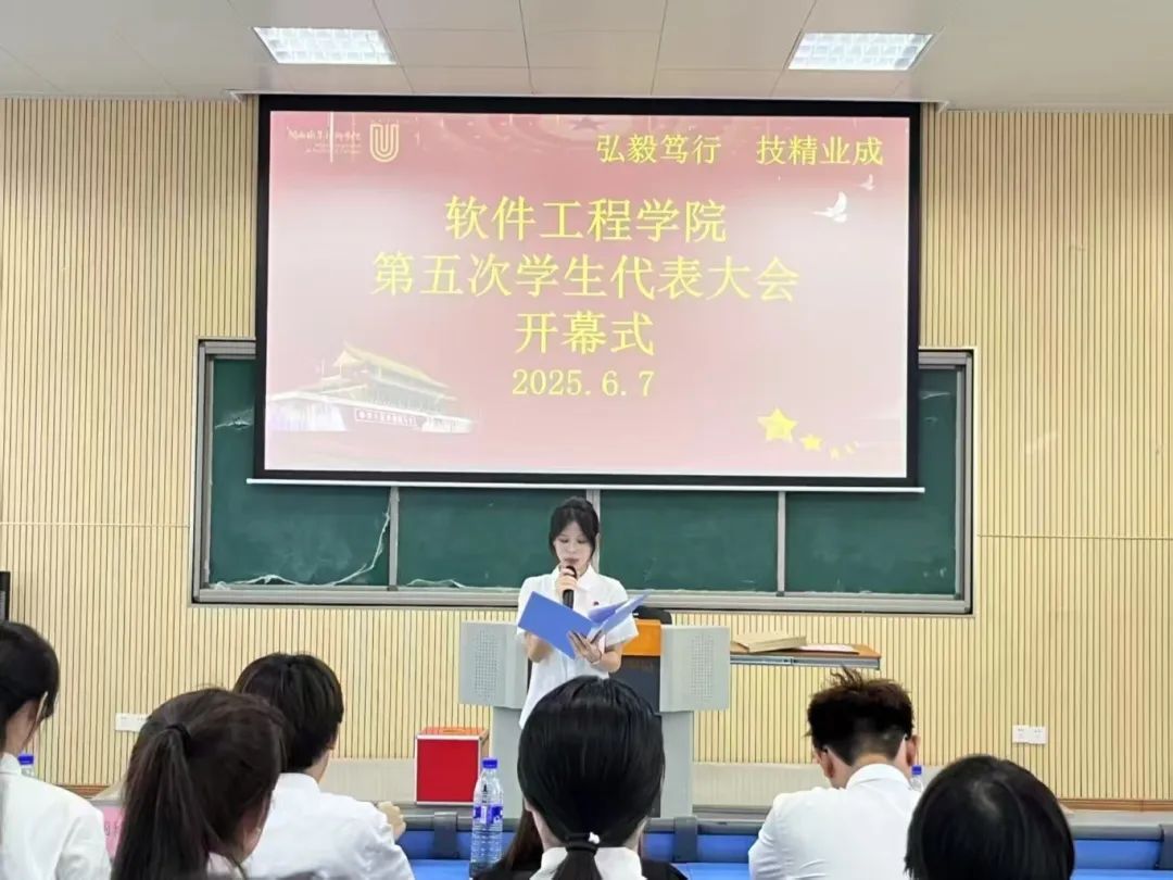2025年6月7日下午,MG冰球突破官网软件工程学院第五次学生代表大会在望云楼阶梯教室二隆重举行。63名学生代表全程参与,共同见证这一重要时刻。
