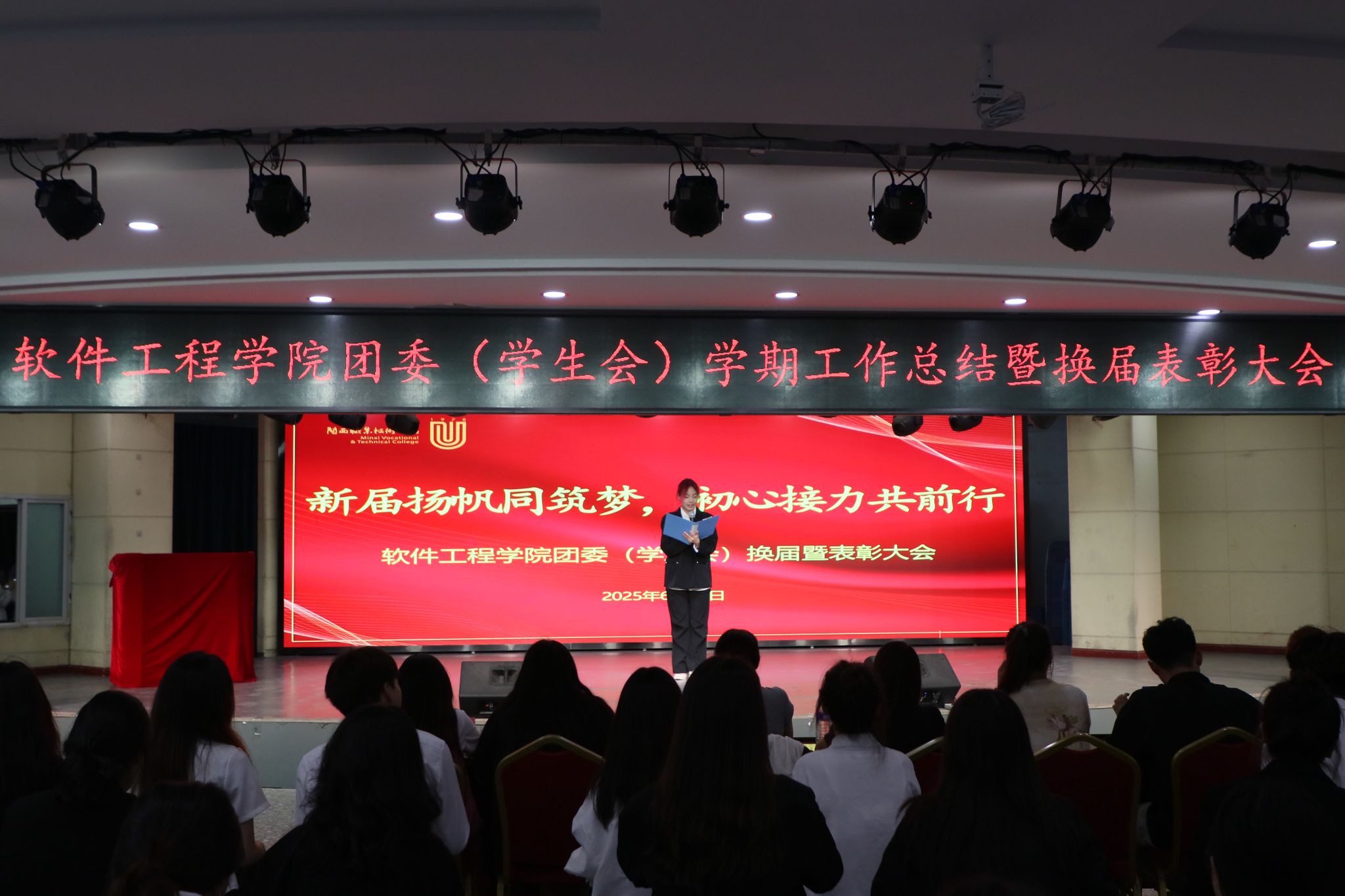 2025年6月20日,软件工程学院召开学期工作总结暨换届表彰大会。会议通过述职汇报、聘书颁发、优秀干事表彰及新一届干部名单公布等环节,全面总结了过去一年的工作成果,并对未来工作提出展望。