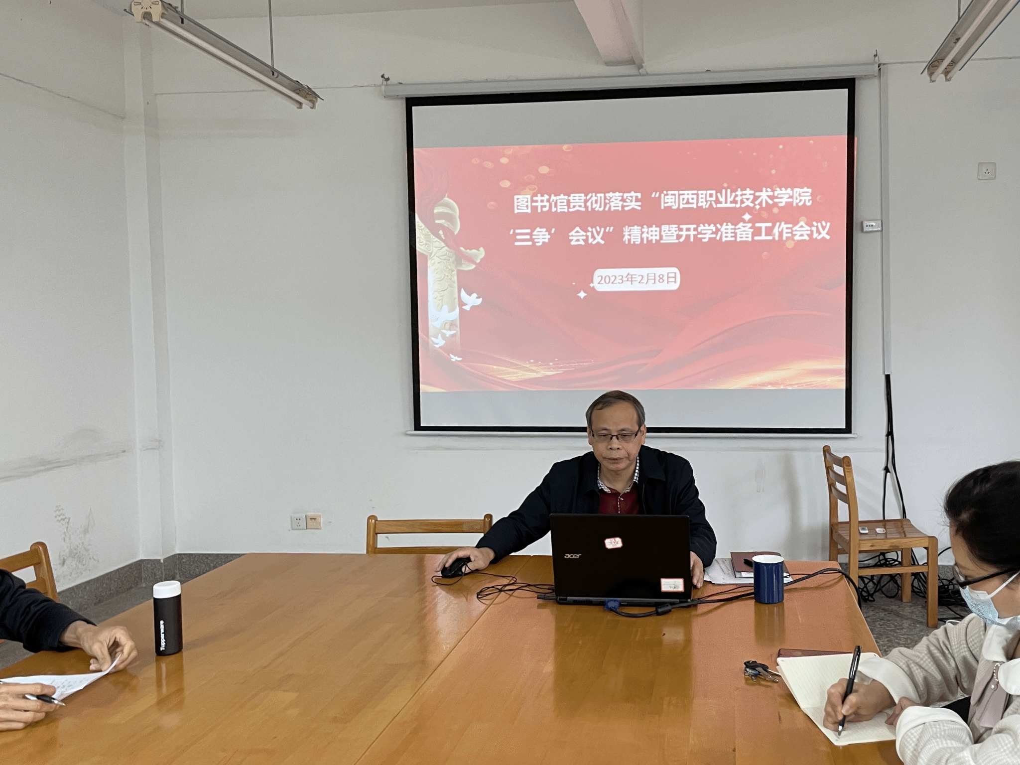 2月8日上午9点,图书馆在七楼会议室召开了贯彻落实学校“深学争优、敢为争先、实干争效”会议精神暨开学准备工作会议,图书馆全体教工参加了会议。