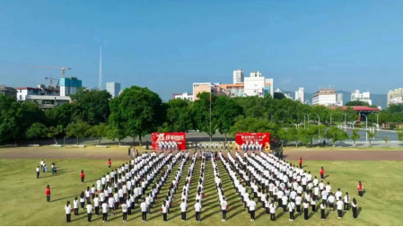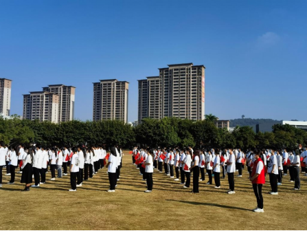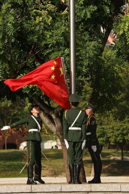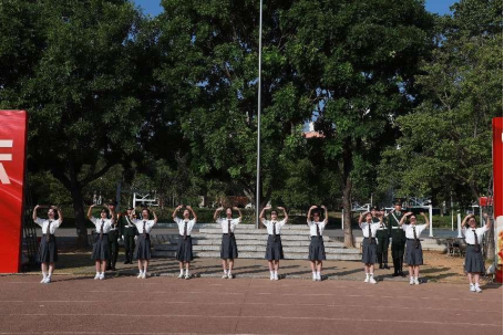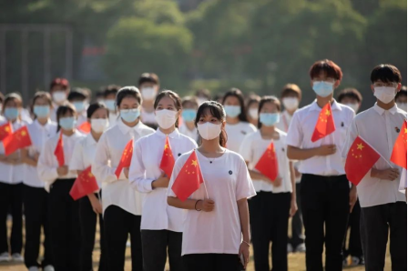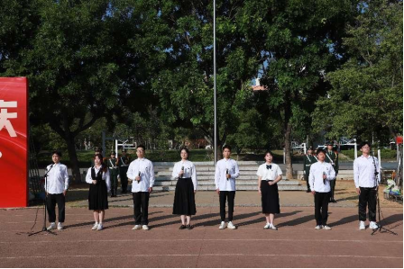 上午8点整,英姿飒爽的校国旗护卫队护送五星红旗进场。伴随着庄严的《义勇军进行曲》,五星红旗冉冉升起,在场所有人向国旗行注目礼,深怀对祖国无限的热爱和崇敬。五星红旗高高飘扬,国歌声在耳边萦绕,一股自豪感油然而生。