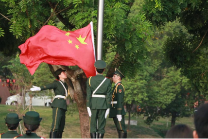 6时40分,校国旗护卫队的同学们迈着铿锵有力的步伐护送国旗。鲜艳的五星红旗在空中冉冉升起,伴随着庄严高亢的旋律,全体师生庄严肃立,向国旗行注目礼。升国旗结束随即国旗半降,全体师生脱帽、静立默哀一分钟,师生集体追思英魂,向革命先烈们致以最深切的哀悼和最崇高的敬意。