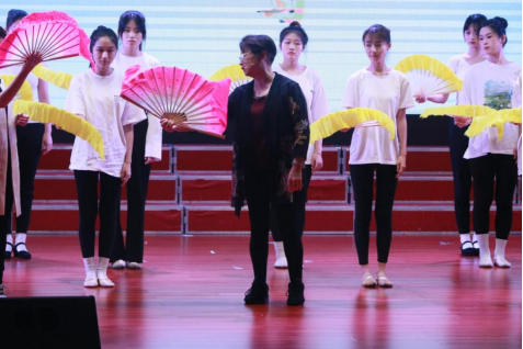 互动环节中,黄淑霞老师随即找了几位同学上台教她们“采茶灯”基础动作。助理老师们富有耐心的教学,让参加学习的同学从一手忙脚乱到找到规律,逐渐熟悉了“三指惗扇子如何惗出美感”“采茶灯独有的‘采茶步’如何走”等动作要领。随后,黄老师引导舞台上刚参加过学习的同学到舞台下绕场一周,给其他观众们进行了现场演示。台下观众纷纷加入到队列当中,更加近距离感受非遗的魅力,气氛瞬间燃了。最后,活动在紧张有趣的答题互动中圆满落幕。