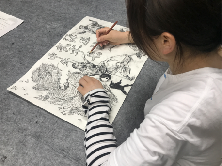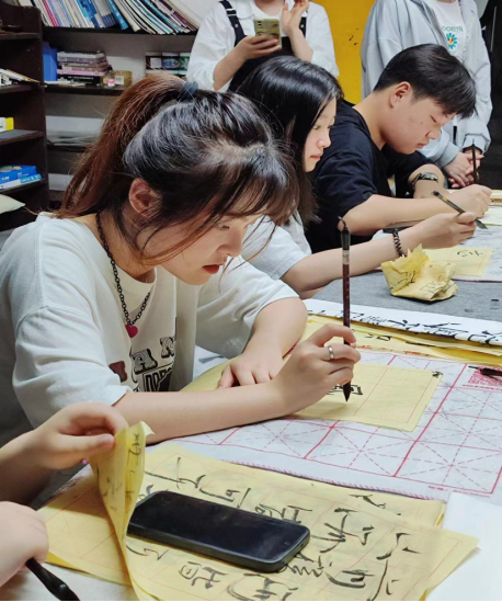 培训活动主要以软笔、硬笔和绘画为主。培训时,同学们都十分积极,聚精会神,整齐端正地坐在桌前耐心地练习着,创作着。练习软笔的同学在宣纸上临摹着流传至今的碑帖,或者用隶书字体创作出一首古诗;练习硬笔的同学则在红格子纸上临摹当今硬笔书法家的字帖,学习书法家们的笔法运势;画画的同学们运用不同的彩笔颜色,绘画出自己心中的一幅画。