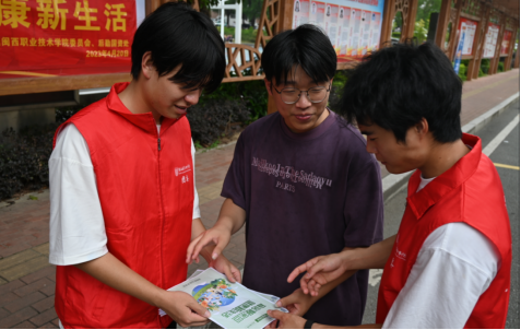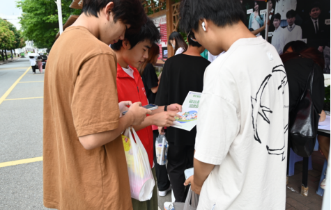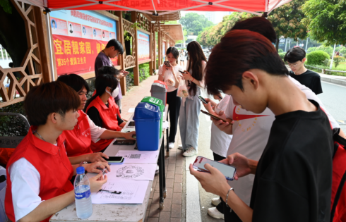 另一方面,志愿者们在宣传点附近向往来的同学们分发有关垃圾分类的宣传单,号召同学们养成良好的生活习惯。宣传点还设置了答题环节,同学们可以通过微信小程序扫码答题,了解垃圾分类的相关知识。往来的同学们纷纷参与,现场气氛十分活跃,志愿者耐心地向同学们讲解着垃圾的类别、标准及方法,并告诉同学们可回收物的利用价值和有害垃圾的危害等有关内容,倡议同学们养成分类投放的好习惯,引导他们增强垃圾分类意识,做垃圾分类的小小参与者。