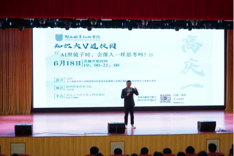 2023年6月18日晚,抖音数字经济产业学院在大匠堂举办知识大V进校园“AI改变产业,引领未来”系列讲座,邀请到人工智能学者高庆一老师,就“AI照镜子时,会像人一样思考吗”为主题,为我们展开讲解关于科技发展的种种奥秘。现场吸引了约七百多名观众。