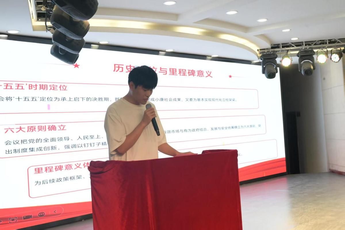 会上,李逸晨、余美琪、陈学涵等同学依次上台,围绕全会核心内容展开分享。同学们从“强国”“高质量发展”“安全”“人民至上”等关键要点切入,结合自身专业与成长感悟,解读了“十五五”规划的蓝图愿景,阐述了青年践行全会精神的实践路径。分享过程中,大家还就现代化产业体系建设、科技创新、民生保障等议题交流见解,展现了青年一代对国家发展的深切关注。