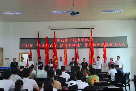 潘巧云同学代表所有参加社会实践的同学表态,吴开卷同学领誓全场“社会实践誓词”,卢书记和刘副校长向各社会实践团队授旗。
