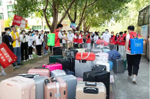 在迎新日子里,MG冰球贴着各个学院迎新彩图的大巴车,不停地在龙岩动车站、长途汽车站、校本部、天马校区间往返穿梭运载新生。接站的志愿者们熟练地完成了接站、疫情防控检查、引导上车等工作,场面秩序井然。