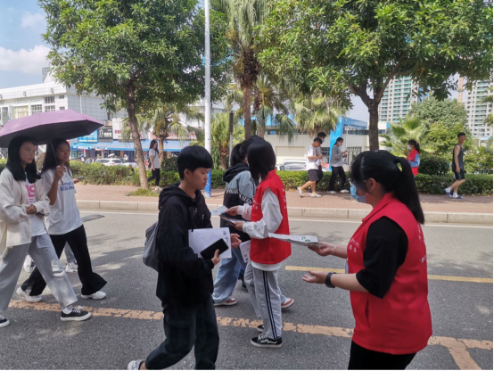 志愿者们身穿红马甲,手持宣传单,在文化长廊和食堂设点宣传,化身“节约分类”小使者,对来往的师生推广节约粮食和垃圾分类的知识。