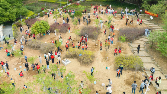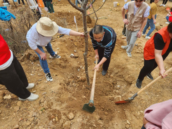 植树现场呈现一片热火朝天的劳动场面,大家以饱满的热情投入到劳动之中,两三人一组互相配合:挖坑、植树、浇水、覆土、固定,手起锄落、放苗回填、提水浇灌……整个过程一丝不苟,各个环节衔接有序、配合默契,齐心合力栽下一棵棵树苗。经过一上午的辛勤劳作,树苗矗立在地里,摇曳在风中,呈现出勃勃生机,形成一道靓丽的风景线。在活动现场,校团委主持工作的陈愉副书记对参加本次活动的全体成员提出倡议:树立绿色发展理念和环保意识、争做低碳科技普及宣传员、积极参与到志愿服务和劳动教育中去。
