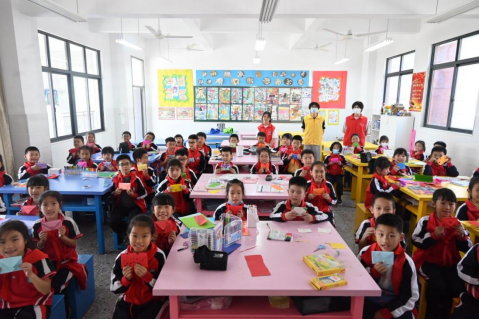 绘本讲解后,老师让小学生们将想对自己所爱的人说的话写进信中,封进由老师指导,学生亲手制作的信封中,以此来引导他们体验动手动脑的乐趣。志愿者们活跃于课堂中,协助老师不断指导学生们进行手工制作,为他们答疑解惑。折完信封已经临近下课,学生们举起心爱的信封进行展示,一个个喜上眉梢,喜笑颜开,并于下课后,与老师和志愿者们到国旗下合影留念。