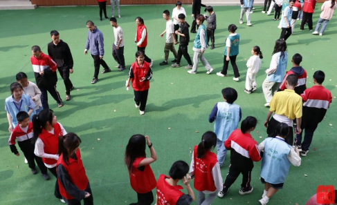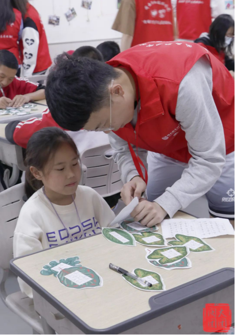 在小操场上,志愿者们通过“驿站传书”“坐地起立”“桃花朵朵开”等几个趣味团辅游戏,结合通俗易懂的语言、简单易学的肢体动作,鼓励孩子们多参与、多体验,使他们从团辅游戏中既找到了乐趣,也获得了成就感。在活动教室中,志愿者们带领孩子们体验书画创作,进行暖心的交流,向孩子们赠予今天大家联合创作的书法作品以及学习用品。