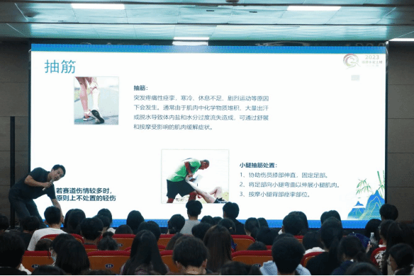 为了正确处理比赛过程中发生的应急医疗事件,张时钦老师为志愿者们开展急救知识专讲。他从三级伤情、二级伤情和一级伤情三个层面,递进式将处理运动员伤情的方法和流程做了详细解答。