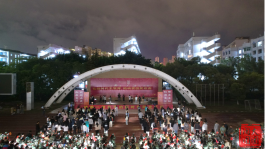 金秋十月,新生军训已渐入尾声,由校学生会主办的“弘扬时代主旋律,唱响爱国爱校曲”主题军训千人合唱活动于2021年10月23日晚在田径场举行。上千名新生积极参与此次活动。活动由学生干部蔡贞同学主持。
