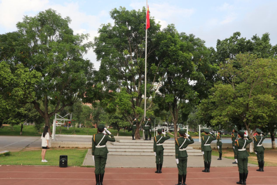 升旗仪式于6点40分准时开始,护旗手们步调一致,衣着整齐,脚踏健步,昂首挺胸地走向升旗台。伴随着庄严雄壮的国歌,面对冉冉升起的鲜艳的五星红旗,全体学生肃立,向国旗行注目礼。