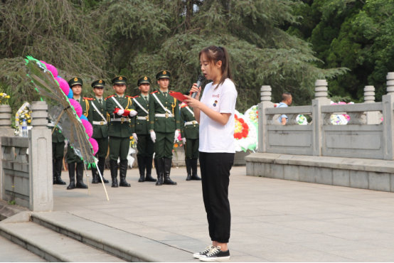祭奠仪式由出旗仪式、敬献花圈、默哀致敬、重温入团誓词、敬献小花等环节组成。校团委傅歆老师发表了祭扫寄语,表达了对先烈和英雄的缅怀和敬意,希望大家珍惜今天的幸福生活,不忘初心、牢记使命。学生代表杜佳薇发表了深情感言,表达了对烈士的崇敬,表明了铭记历史,砥砺前行的决心。