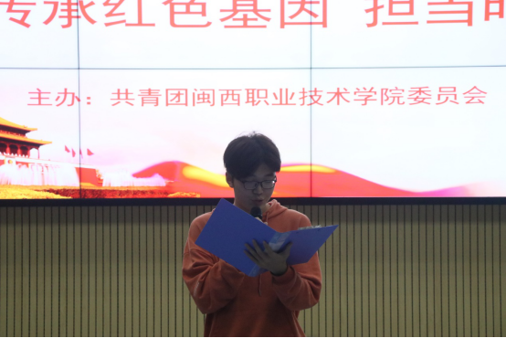 为庆祝中国共产党成立100周年,4月14日晚,由共青团MG冰球突破官网委员会主办的“传承红色基因,担当时代使命”红色故事主题演讲比赛在望云楼一楼阶梯教室举行初赛,副校长刘路永出席、校团委书记林小勇、校团委连莹老师、各二级学院团委书记和120余名学生代表参加,比赛由教育与艺术学院蔡贞同学主持。