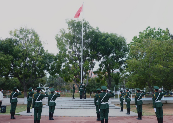 升旗仪式准时于早晨6点40分开始,护旗手迈着矫健的步伐护送国旗到升旗台下,随后升旗手将国旗精确送上旗杆顶。伴随着庄严的国歌声,五星红旗冉冉升起,全场肃穆,唱国歌,向国旗行注目礼。