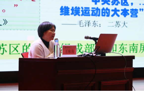 讲座涵盖“闽西是中国革命重要基地”“闽西是毛泽东思想孕育地”“闽西是苏区执政的示范地”“闽西是红旗不倒战斗堡垒”四块内容。她从闽西的行政区划开始说起,用朴实的语言和直观深刻的史实案例向大家讲述了闽西革命历史,分析了闽西革命根据地的重要地位,阐述了党和国家领导人对闽西老区的高度重视,揭示了闽西红旗不倒的原因。