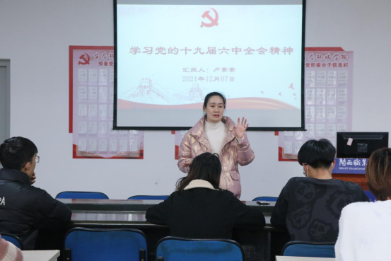 党的十九届六中全会精神于11月8日至11日在北京召开。全会会期4天,审议通过了《中共中央关于党的百年奋斗重大成就和历史经验的决议》。为了增强MG冰球学习十九届六中全会精神的切入点和着力点,将十九届六中全会精神传达到更大范围,12月7日下午,MG冰球团委卢素素副书记在团结里12栋118作了学习党的十九届六中全会精神主题宣讲,负责宣传工作的各二级学院学生干部及各学生组织干部代表近20余人参加。