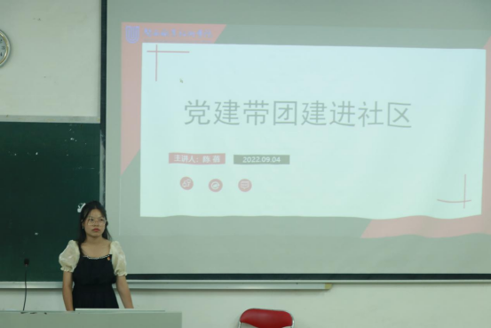 校(学生)团委宣传部陈蓓上台发言,总结了上学期党建带团建进社区工作落实不到位的情况,并提出了相应的解决措施。她详细讲解了“青春向党工程”“青春飞扬工程”“青春如歌工程”“青春活力工程”“青春筑梦工程”等党建带团建进社区五大工程,明确了各工程的实施方法与推进步骤。
