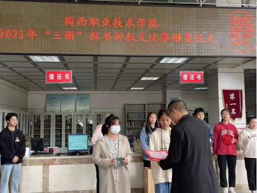 本次活动为期一个多月,得到了全校学生的热烈响应,征集到参赛书评共计81篇,评审委员对参赛作品进行匿名评审。最终19级学前7班林小如《溯中华民族之源流,辟中华文脉之新篇——<楚辞>书评》荣获一等奖;21级软工6班潘宝清《<诗经>书评》和20级学前5班游明婧《<围城>书评》荣获二等奖;21工程造价3班江锦荣《三字为训,“经”通人世》、21工程造价3班范徐年《以死撼活,为了活着而活着》和20级工程造价2班黄芯娜《人皆平凡皆不凡》荣获三等奖;21级软件3班陈枫《评<红楼梦>》、20级工程造价1班官佳颖《以讽世,证公心》、 20级学前5班袁英《取经之路,我们携手共进》、20级室内3班古文凯《真正的历史是有感情的——评<明朝那些事>》和20级学前1班蔡惠霖《活着》荣获优秀奖。12月17日校团委林小勇书记和校图书馆郭春花副馆长在校图书馆为获奖者颁奖。