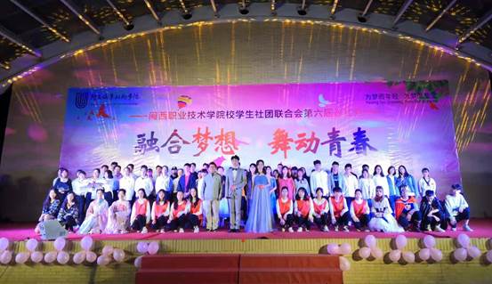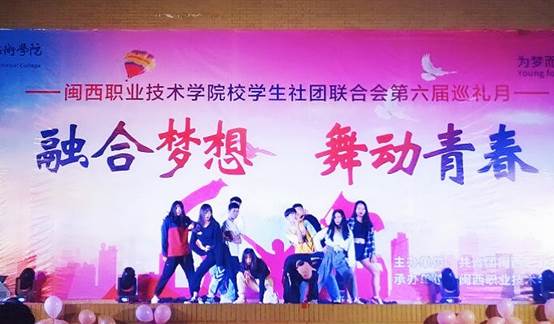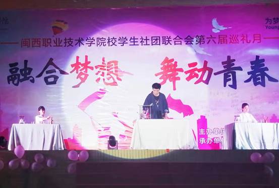 晚会在学生社团负责人走红毯,签名中开始。然后,Top街舞社的热力开场舞《这就是街舞》、英语协会和吉他社合作的舞台歌曲串烧《遥远的你》、跆拳道社的表演《格斗术》,影剧社和足球协会合作的舞台剧《白雪公主》、清和茶艺社携手读者协会和书画协会的展示《迎新茶贴》,青空动漫社的才艺表演《天策枪魂》、爱心协会和绿源环保协会联合带来手语《仰望星空》、社联文体部古筝弹唱《赤伶》、双截棍社团的特色展示《黑武》等节目将晚会推向高潮,精彩的节目赢得场下阵阵掌声。最后,在MG冰球社团联合会全体成员大合唱《我和我的祖国》的歌声中,闽西职业技学院第六届社团巡礼月开幕式完美收官。