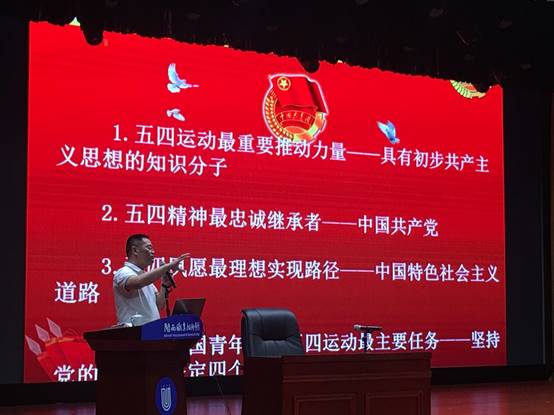 团省委陈训明副书记主讲,题目是《传承五四精神 让世界听见青春中国的强劲心跳》。他从介绍我国伟人的丰功伟绩和文化名人的先进事迹开始,穿插融时尚风貌和新时代精神为一体的有奖问答,向在场观众阐述了“青年的使命与责任”“向总书记学习是最好的学习”“向内在寻找成长的力量”三个方面的问题,使五四百年启示和青春奋斗之歌铭记于师生之心,生动诠释了习近平总书记在纪念五四100周年大会上对新时代中国青年提出的要求。