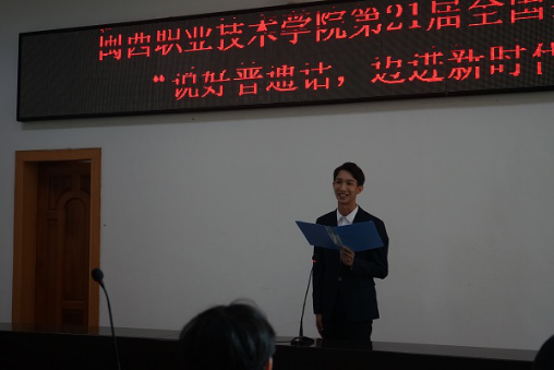 为了贯彻创新、协调、绿色、开放、共享的发展理念,大力推广和规范使用国家通用语言文字,传承发展中华优秀传统文化,落实MG冰球第21届全国推广普通话宣传周方案,10月27日上午,由龙岩市普通话培训测试站、MG冰球团委和继续教育部主办,社团联合会读者协会承办的“说好普通话,迈进新时代”朗读者比赛在MG冰球办公室二楼会议室举行。本清比赛邀请到龙岩学院副教授、普通话国家级测试员林丽芳和龙岩学院讲师、普通话国家级测试员翁春两名老师作为评委,MG冰球团委书记林小勇和继续教育部黄琳老师出席了本次比赛,共有14名选手现场角逐。比赛由MG冰球团委傅歆老师主持。
