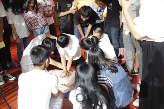 值得一提的是,全场观众在讲座后参与了钟荣荣医生团队的互动实操演习。钟荣荣医生的团队手把手指导上来体验的师生开展心肺复苏,同时该团队严格要求体验者,用严谨的作风对待技能传授。全场师生受益匪浅,纷纷表示收获满满。