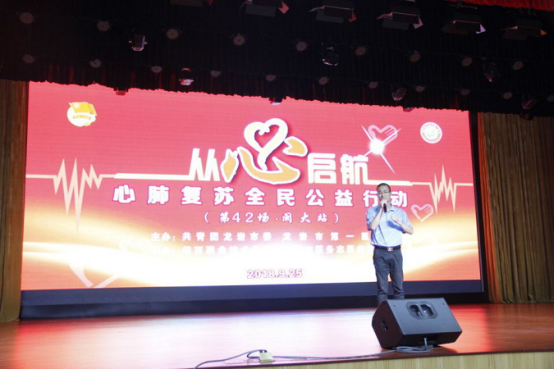 紧接着,龙岩市医务志愿者协会会长、2015年度全国优秀共青团干部、2018年度福建省岗位学雷锋标兵、2018年度福建省五星级志愿者、“从心启航”心肺复苏全民公益行动项目负责人、龙岩市第一医院钟荣荣医生从“什么是意识丧失和呼吸停止”、“怎么判断意识丧失和呼吸停止”、“心肺复苏的作用”、“心肺复苏的流程”进行了详细的阐述。他用现实案例、视频演示和实时数据向观众们一遍又一遍得传授心肺复苏术,得到全场数次热烈掌声。