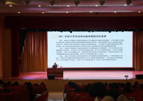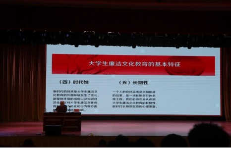温献荣书记以东汉著名学者王逸的名言“不受日廉,不污日洁”为引,详细阐述了“廉洁文化相关概念”“大学生廉洁文化教育的基本特征”“大学生廉洁文化教育理论依据”“新时代加强大学生廉洁文化教育的现实依据”“加强大学生廉洁文化教育的对策与方法”“警示教育--扣好人生第一粒扣子”等六个大项内容。他要求与会大学生干部认真学习《大学生廉洁文化教育》和《大学生思想政治教育》,领会其内容,感悟其精神;要求他们有计划、有步骤地认真学习“创新大学生廉洁文化教育方式”和“文化大学生廉洁文化教育环境”战略方针,大力营造崇尚廉洁的校风;要求他们主动跟腐败现象作斗争,多管齐下,靠党的领导、制度和社会监督营造“不敢腐、不能腐、不想腐”的廉政新局面。