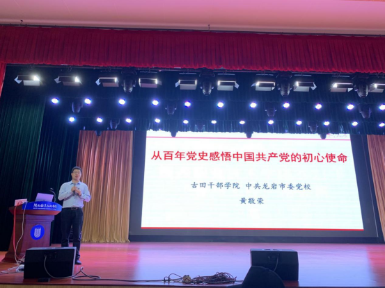 4月1日晚上,由校团委主办的“青马工程”培训班讲座在大匠堂举行。此次讲座由古田干部学院、中共龙岩市委党校黄敬荣老师作《从百年党史感悟中国共产党的初心使命》的党史教育主题报告。讲座由校团委杜谷文副书记主持,2021年“青马工程”培训学员及2019级、2020级班级团支书共300名学生干部参加。