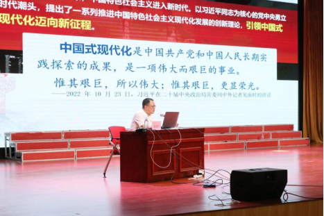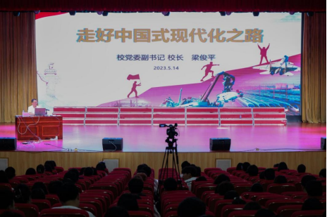 讲座由“接续奋斗,追求千年梦想”“立足国情,开辟全新道路”“凝心聚力,推进复兴伟业”三个部分组成。梁俊平校长以什么是中国梦为题,激发同学们的爱国情怀,并表明中华民族伟大复兴是人民的梦想,是民族的梦想,是我们的伟大中国梦。他从中国知识界首次就中国现代化从文化方面是要西方化还是本土化;发展方面是要工业立国还是农业立国;模式上是要走个人主义还是资本主义等问题,说明了“国尚不立何以建设家园?”的实质。他还详细分析讲解了中国式现代化“是人口规模巨大的现代化”“是全体人民共同富裕的现代化”“是物质文明和精神文明相协调的现代化”“是人与自然和谐共生的现代化”“是走和平发展的现代化”五个特征。