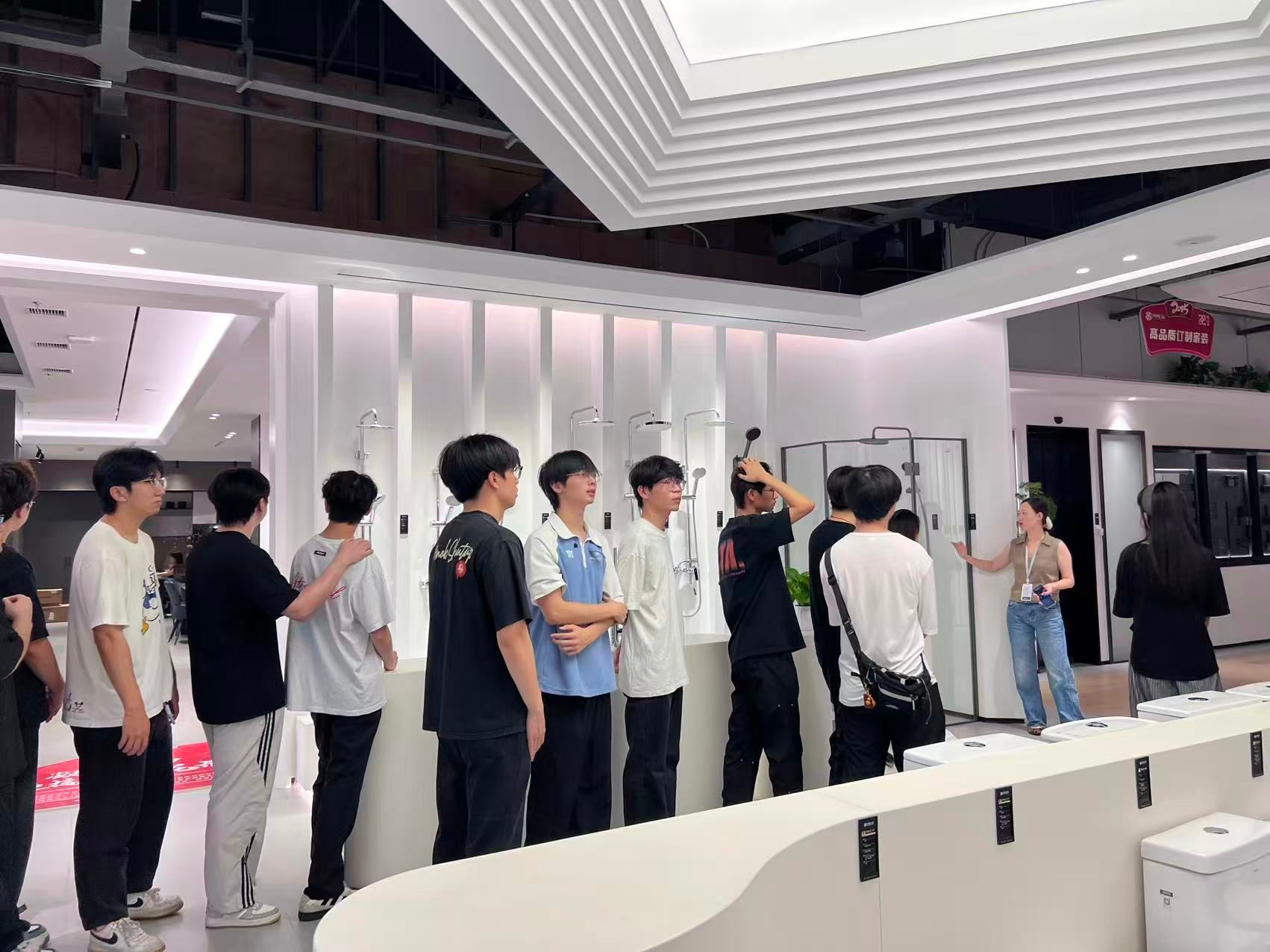 第二站:揭秘材料的奥秘。在琳琅满目的材料展厅,同学们近距离地触摸、比较各种瓷砖、木板、涂料和智能家居产品。企业人员耐心讲解了不同材料的特性、环保标准和应用场景,一堂生动的“材料学”课就在眼前展开。