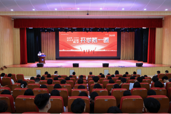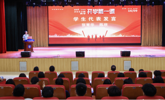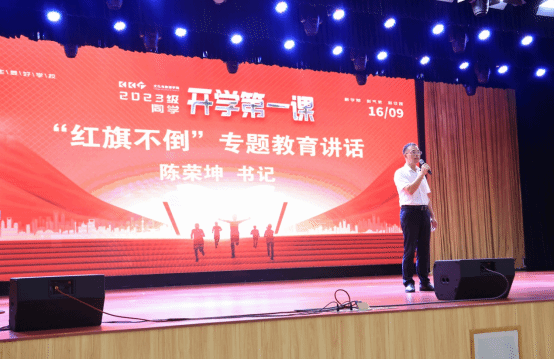 庄严的音乐响起后,全体师生起立共唱国歌,在振奋而激动的氛围中正式开启“开学第一课”。学院党委书记陈荣坤上台作“红旗不倒”专题教育讲话,首先向全体新生的到来表示热烈的欢迎,号召全体新生向革命前辈学习,自信担当、积极进取、勇于拼搏,祝福大家度过愉快的、有意义的大学时光,努力成为一技在手的新时代阳光工匠。