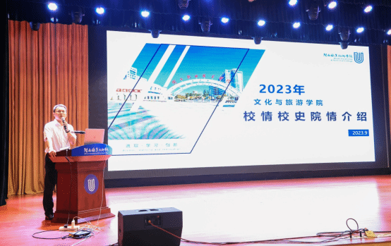 黄宇方副院长向全体新生开展了校情校史院情教育,对学校的历史,学校的发展和构架,以及文化与旅游学院专业构成、取得的成绩进行了系统的介绍,让23级新生对学校、学院有了进一步的了解,增强了自豪感和自信心。