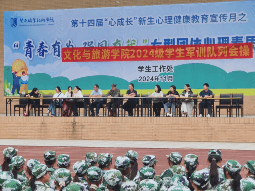 11月16日下午4时,文旅学院全体新生军训会操在MG冰球突破官网南校区举行。文旅学院在家党政班子成员、教官代表和辅导员代表共计11人观看会操并参与打分,会操由郭夏阳副书记主持。