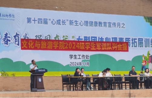 会操结束后,文化与旅游学院陈荣坤书记与郭夏阳副书记先后发表了讲话。他们对同学们在军训期间所展现出的坚韧不拔、勇往直前的精神风貌给予了高度评价,并勉励大家将军训中学到的纪律性、团队精神带入日后的学习与生活中。同时,他们也向辛勤付出的教官们表示了衷心的感谢。此次军训会操不仅是对新生军训成果的一次检验,更是对他们意志品质和团队协作精神的锤炼。相信文旅学院的学子们将不负韶华,砥砺前行,书写更加辉煌的篇章。