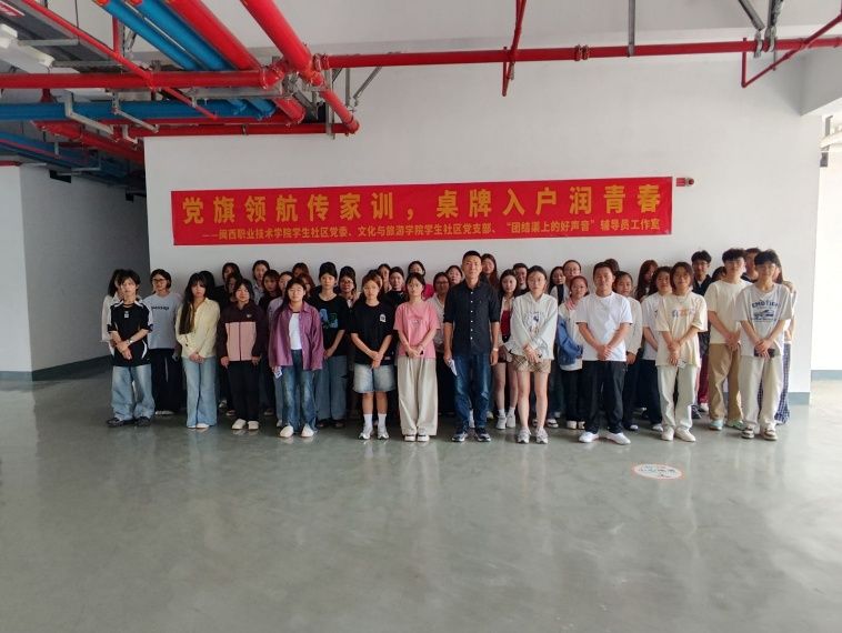 2025年4月18日上午,文化与旅游学院联合“团结渠上的好声音”辅导员工作室共同开展了“党旗领航传家训,桌牌入户润青春”家训进宿舍主题教育,活动由文旅院思政工作负责人主持,50余名同学参加。